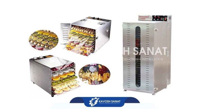 جریان هوای گرم: پس از چیدمان میوهها یا سبزیجات، دستگاه شروع به کار میکند. هوای گرم از طریق یک منبع حرارتی (مانند مشعل گازی یا سیستم برقی) تولید میشود و سپس به وسیله فنها به داخل دستگاه منتقل میشود. این جریان هوای گرم بهطور یکنواخت در تمامی سینیها و روی میوهها یا سبزیجات پخش میشود.