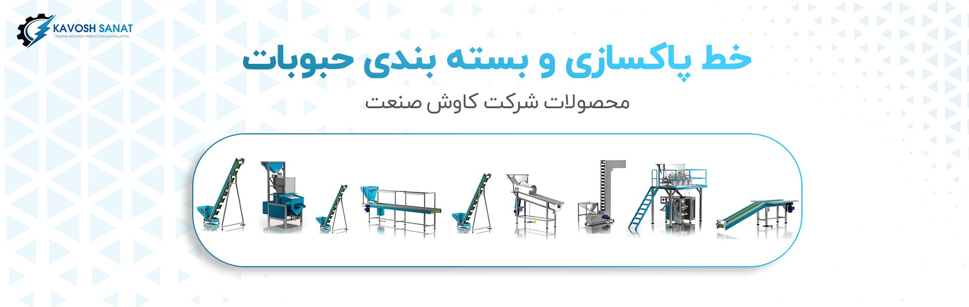 خط کامل بسته بندی حبوبات کاوش صنعت متشکل از سه دستگاه بالابرانتقال ، دستگاه بسته بندی و نوار نقاله حمل بسته است.حبوبات توسط اپراتور داخل مخزن بالابر Z یا بالابر مدولار ریخته می شود و توسط بالابر به مخزن دستگاه بسته بندی منتقل می شود. مخزن دستگاه بالابرz و بالابر مدولار کاوش صنعت دارای سیستم ویبراتور جهت ورود سریعتر مواد به بخش بالابرو در نهایت انتقال سریعتر به مخزن دستگاه بسته بندی است. این دستگاه ها قادرند تا 2 تن محصول را در مدت 1 ساعت به مخزن دستگاه بسته بندی انتقال دهند. دستگاه بسته بندی براساس تنظیمات وزنی که توسط اپراتور تعیین می شود با تیراژمشخصی حبوبات  بسته بندی شده آماده را به دستگاه نوارنقاله منتقل می کند و در نهایت بسته ها توسط اپراتور تحویل گرفته میشود. دستگاه پکینگ کاوش صنعت قادر به بسته بندی با سلفون های PVC-OPP-CPP-BOPP-Metallized-Polyethylene است.